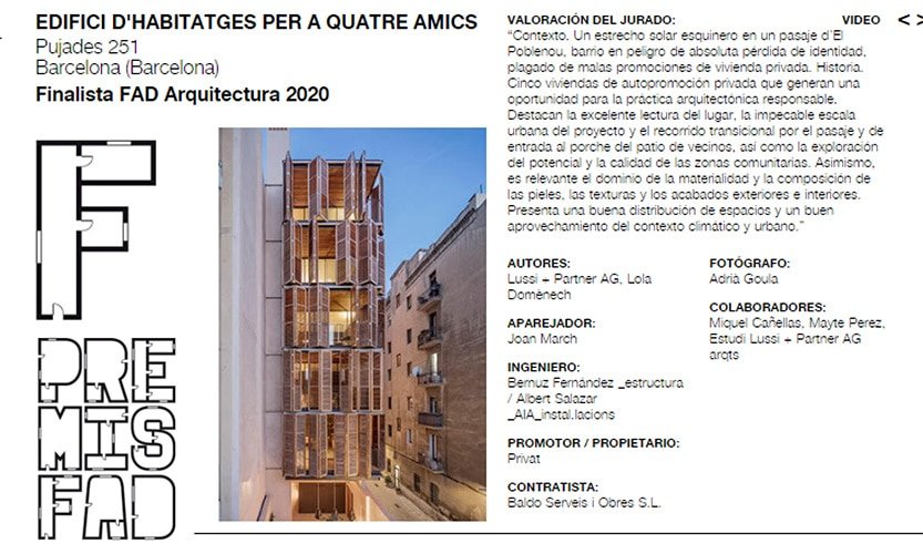 El passat any 2019 vam dur a terme la construcció d’un edifici plurifamiliar molt especial al carrer Pujades de Barcelona. Aquest projecte ha estat escollit com a un dels finalistes del Premi FAD d’arquitectura 2020. Esperem amb il·lusió la celebració d’aquesta edició.