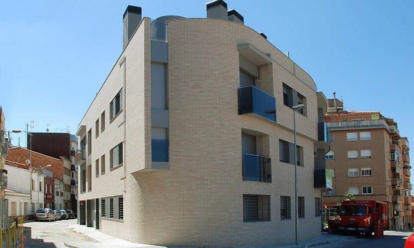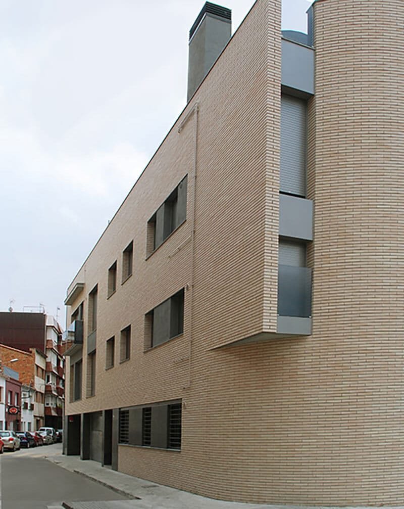 Construcción de un edificio plurifamiliar de 12 viviendas, situado en la calle Clavé en el núcleo urbano de Castellar del Vallès. Planta sótano destinada a aparcamiento y planta baja más dos plantas piso con viviendas de diferentes dimensiones. Proyecto desarrollado por el arquitecto Pere Roca.