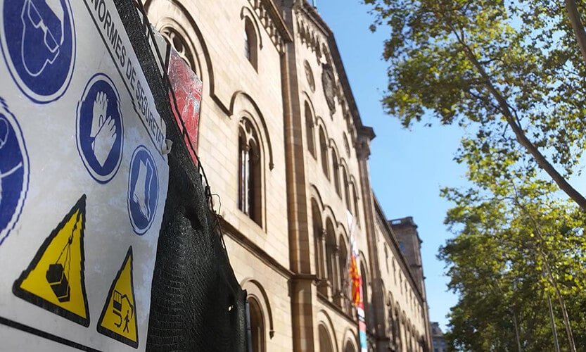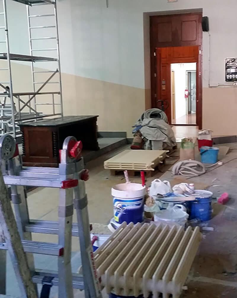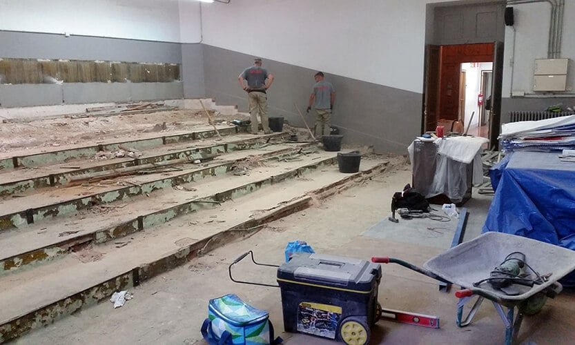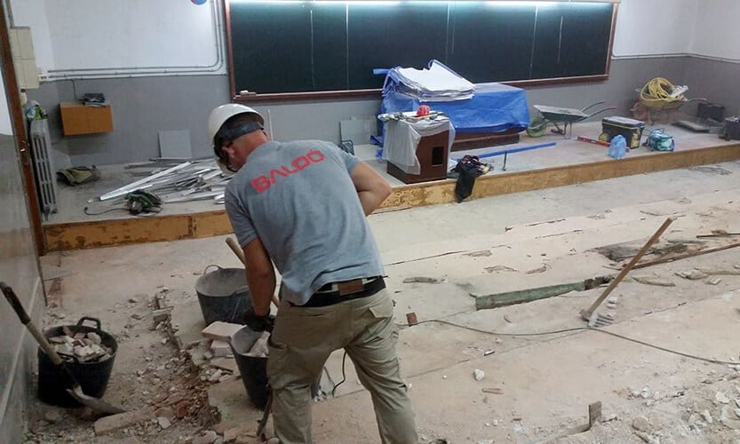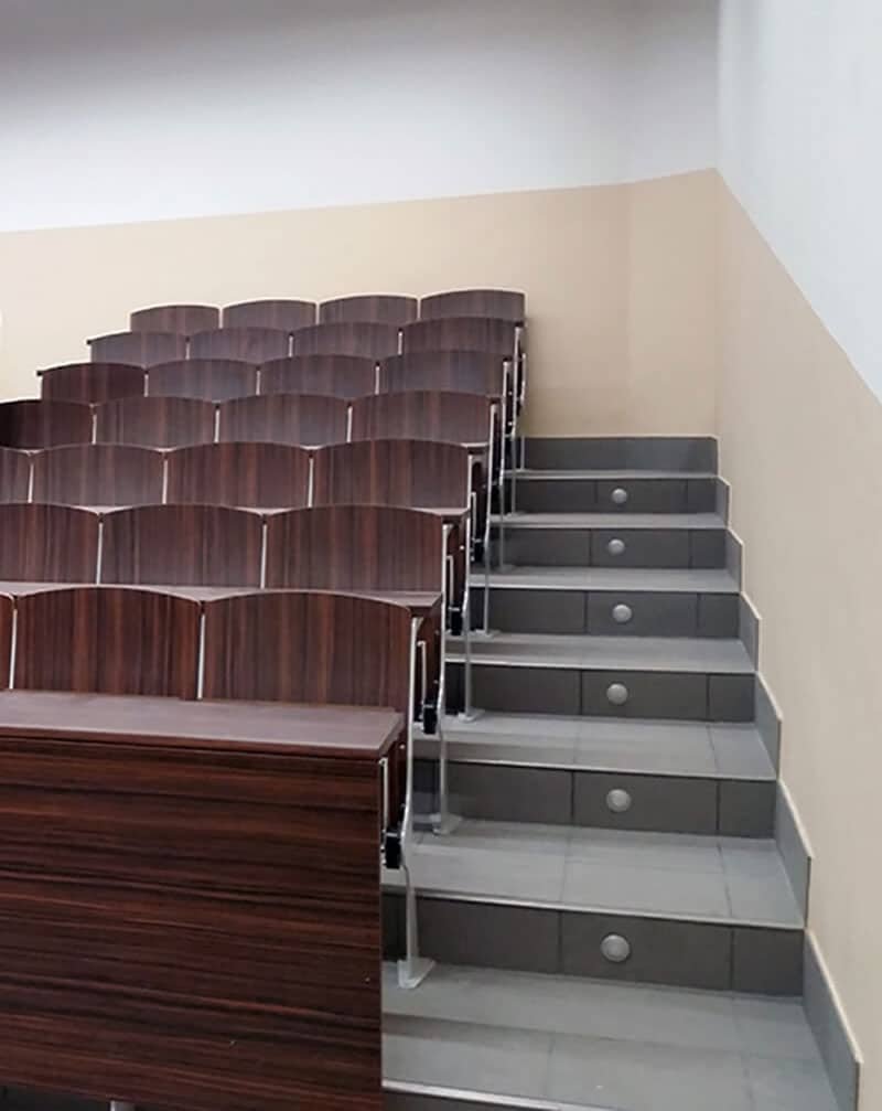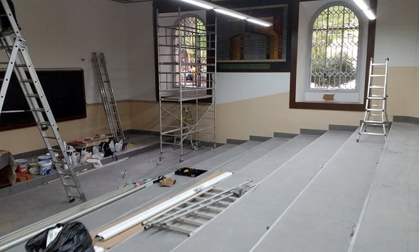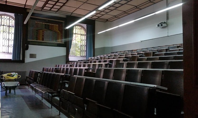 Actuación realizada en el ámbito del mantenimiento y reparación de edificios e instalaciones de la Universidad de Barcelona. Trabajos de reforma integral del Aula 111 del edificio histórico de la Facultad de Filología. Formación de gradas y accesos, renovación de instalaciones y mobiliario.